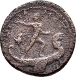 Cadmus advancing right, head left, holding sword and raising right arm, on galley, left, with shield on aphlaston at stern ending; left, murex shell