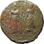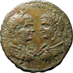 radiated Zeus Askraios standing facing between two trees surmounted by oracular crow, with Hera standing in biga drawn by peacocks, left, holding patera and long sceptre |