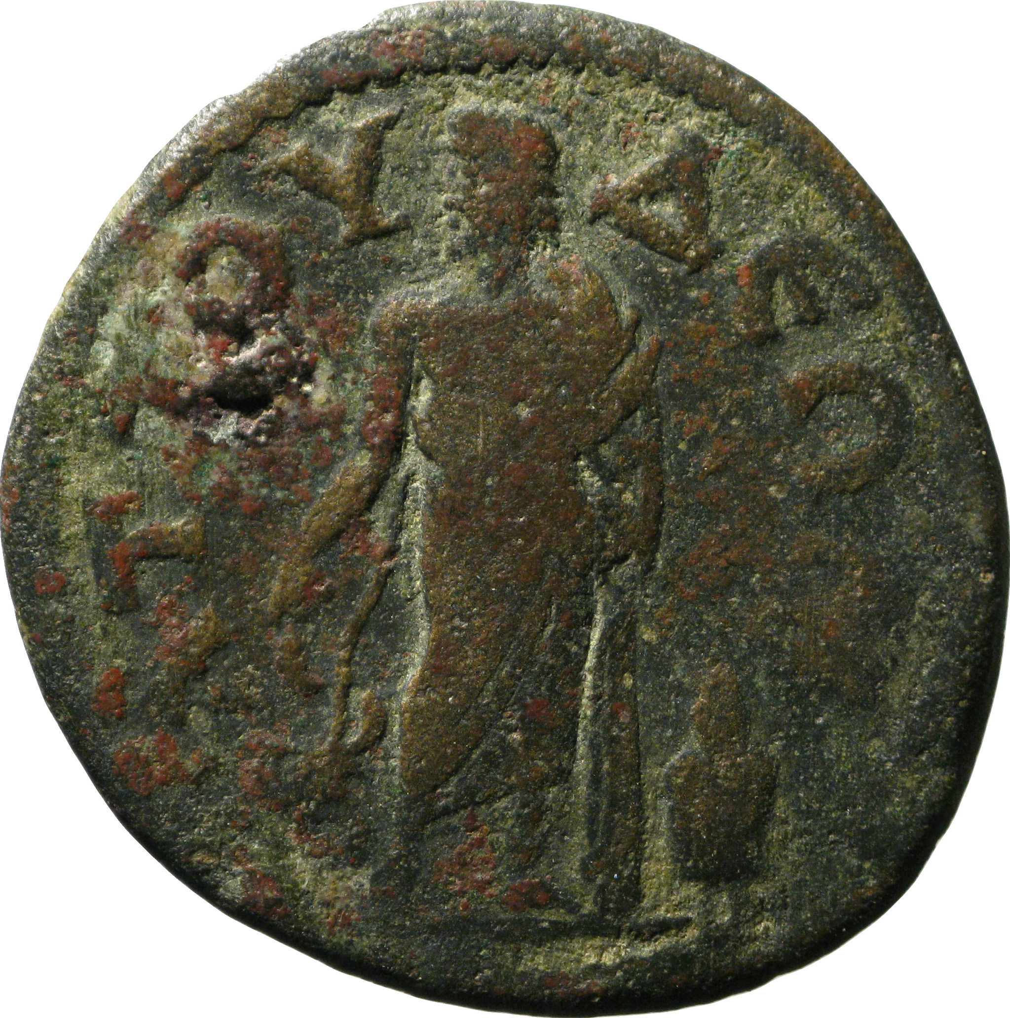 Asclepius standing facing, head left, his left hand at his hip, resting with right on serpent-staff, Telesphorus at his feet