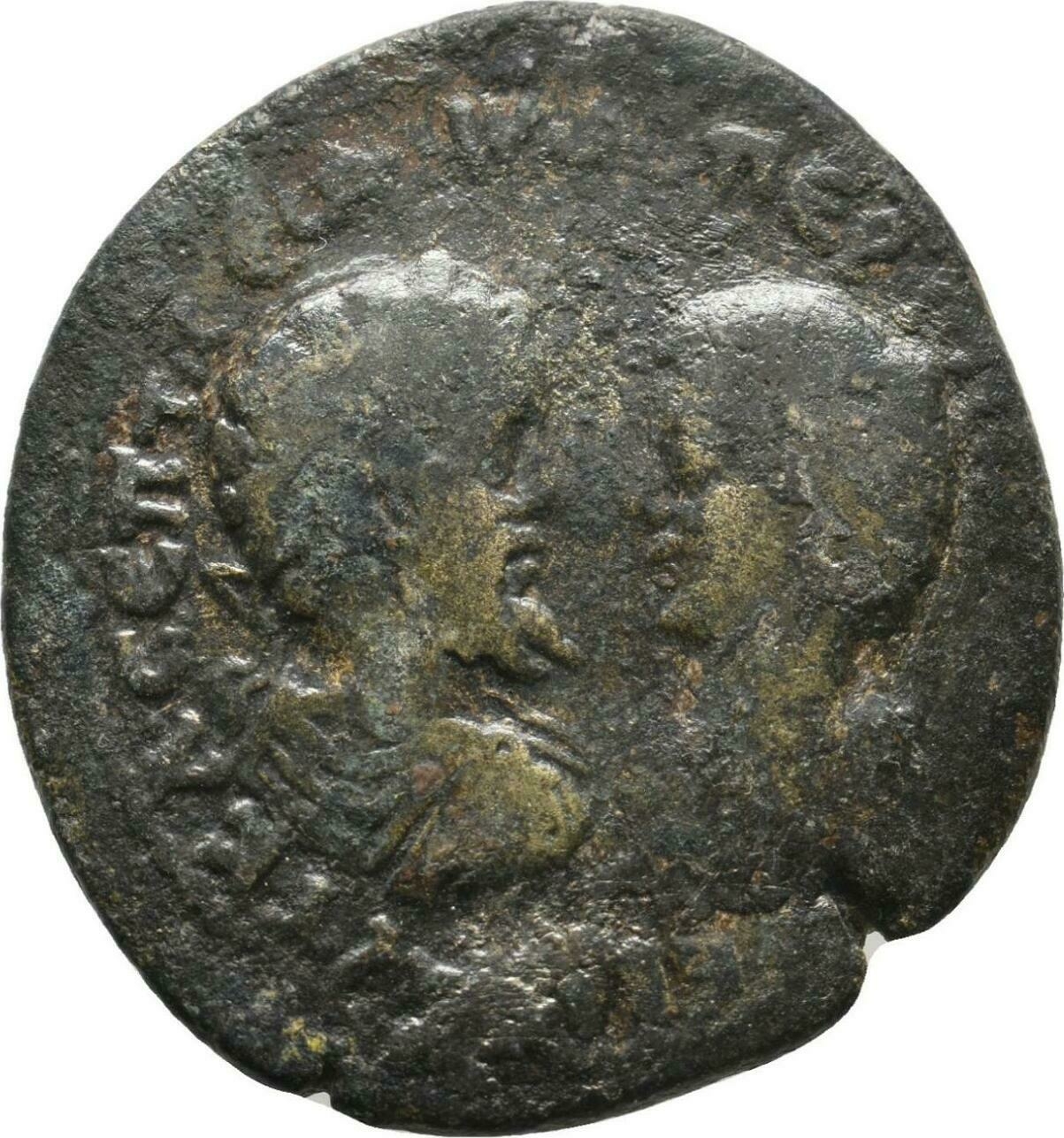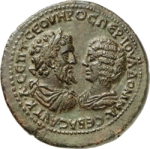 laureate, draped and cuirassed bust of Septimius Severus, right, seen from rear, facing draped bust of Julia Domna, left |
