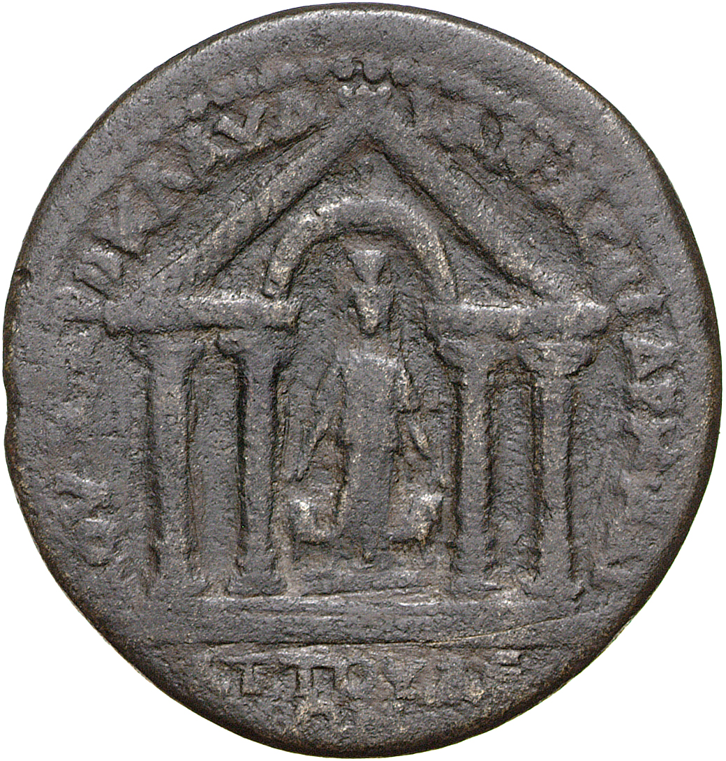 temple with four columns enclosing Cybele standing facing, between two lions |