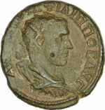 radiate, draped and cuirassed bust of Philip I, right, seen from rear