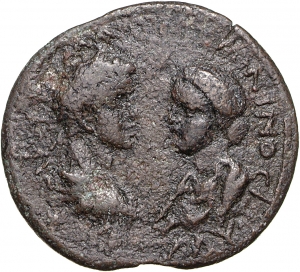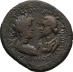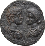 laureate, draped and cuirassed bust of Caracalla, right, seen from rear, facing draped bust of Plautilla, left |