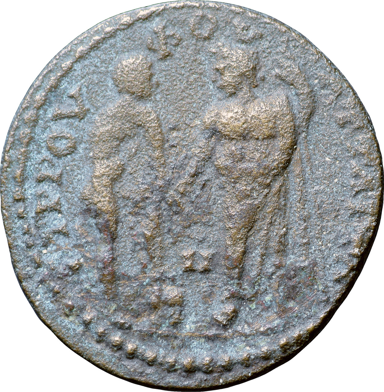 to left, nude male figure (founding hero?) standing with foot on base, right, leaning forward; to right, cult statue of Zeus standing facing, head, left, holding thunderbolt over eagle and long sceptre; Zeus and eagle on base; before base, small figure (infant?) |