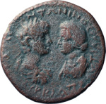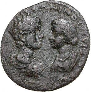 laureate, draped and cuirassed bust of Caracalla, right, seen from rear, facing draped bust of Plautilla, left |