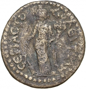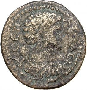 bare-headed, draped and cuirassed bust of Geta, right, seen from rear