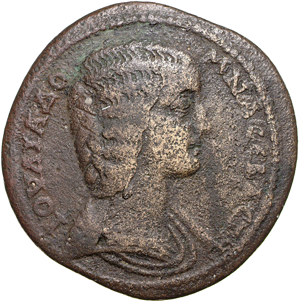 Zeus standing facing, head left, holding eagle in his extended right hand, left resting on sceptre; on left, Hera standing facing, head right, wearing kalathos, holding pomegranate in her left hand, right resting on sceptre; on right, Athena standing facing, head left, with peplos and helmet, holding olive branch in her lowered right hand, spear and shield in left |