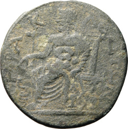 Asclepius seated on throne, left, staff in his left hand, his right hand towards a serpent in front of him