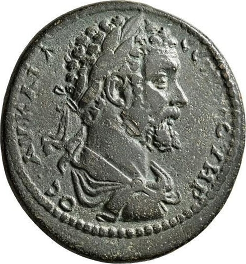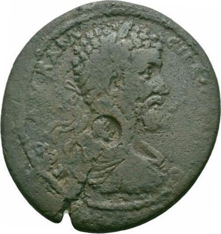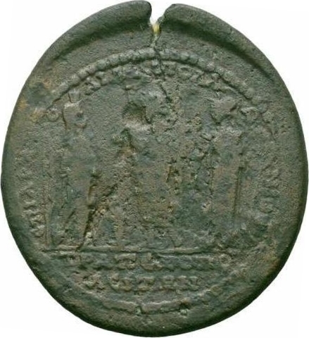 Zeus standing facing, head left, holding sceptre in right hand; on left, Hera standing facing, head right, wearing kalathos, holding pomegranate in her left hand, right resting on sceptre, lighted altar at her feet; on right, Athena standing facing, head left, with peplos and helmet, holding olive branch in her lowered right hand, spear and shield in left |