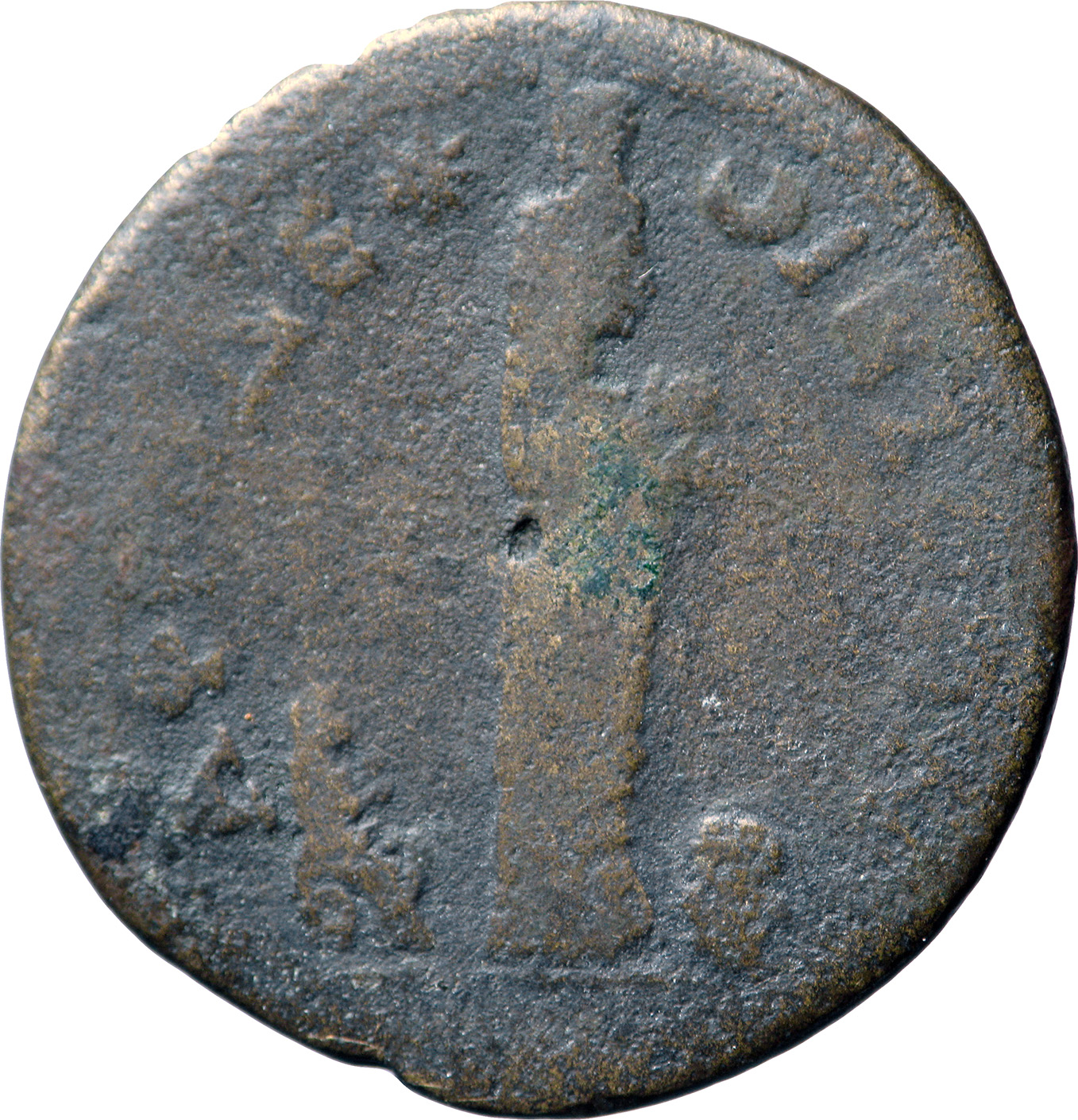 cult statue of Aphrodite of Aphrodisias right, at left priestess seated right and in upper field star, at right fountain (?) and in upper field crescent