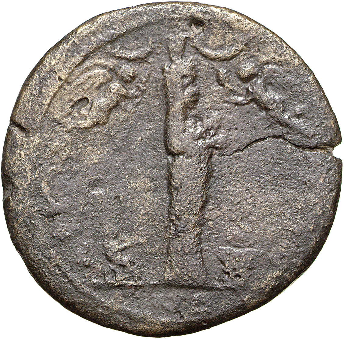 cult statue of Aphrodite of Aphrodisias right, between two Eroi and two swags in upper field, at left priestess seated right and in upper field star, at right fountain (?) and in upper field crescent