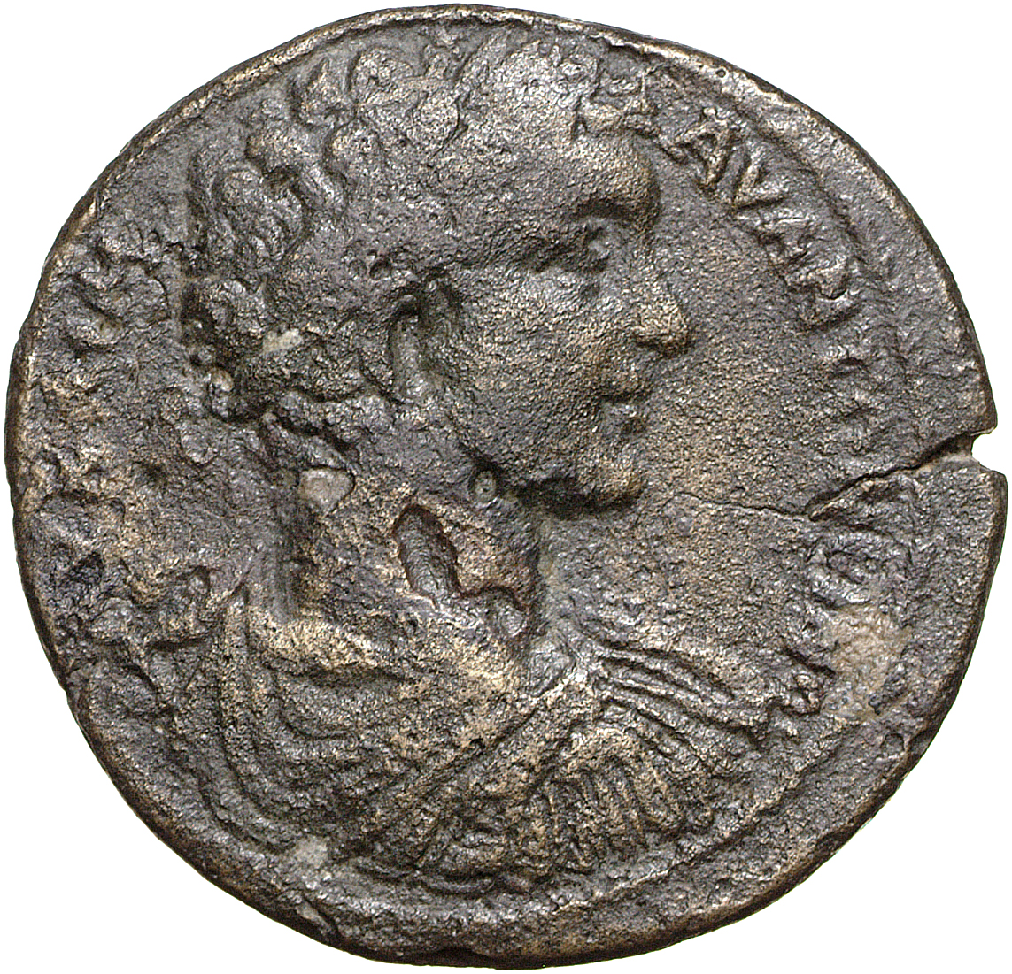 laureate, draped and cuirassed bust of Caracalla, right, seen from rear