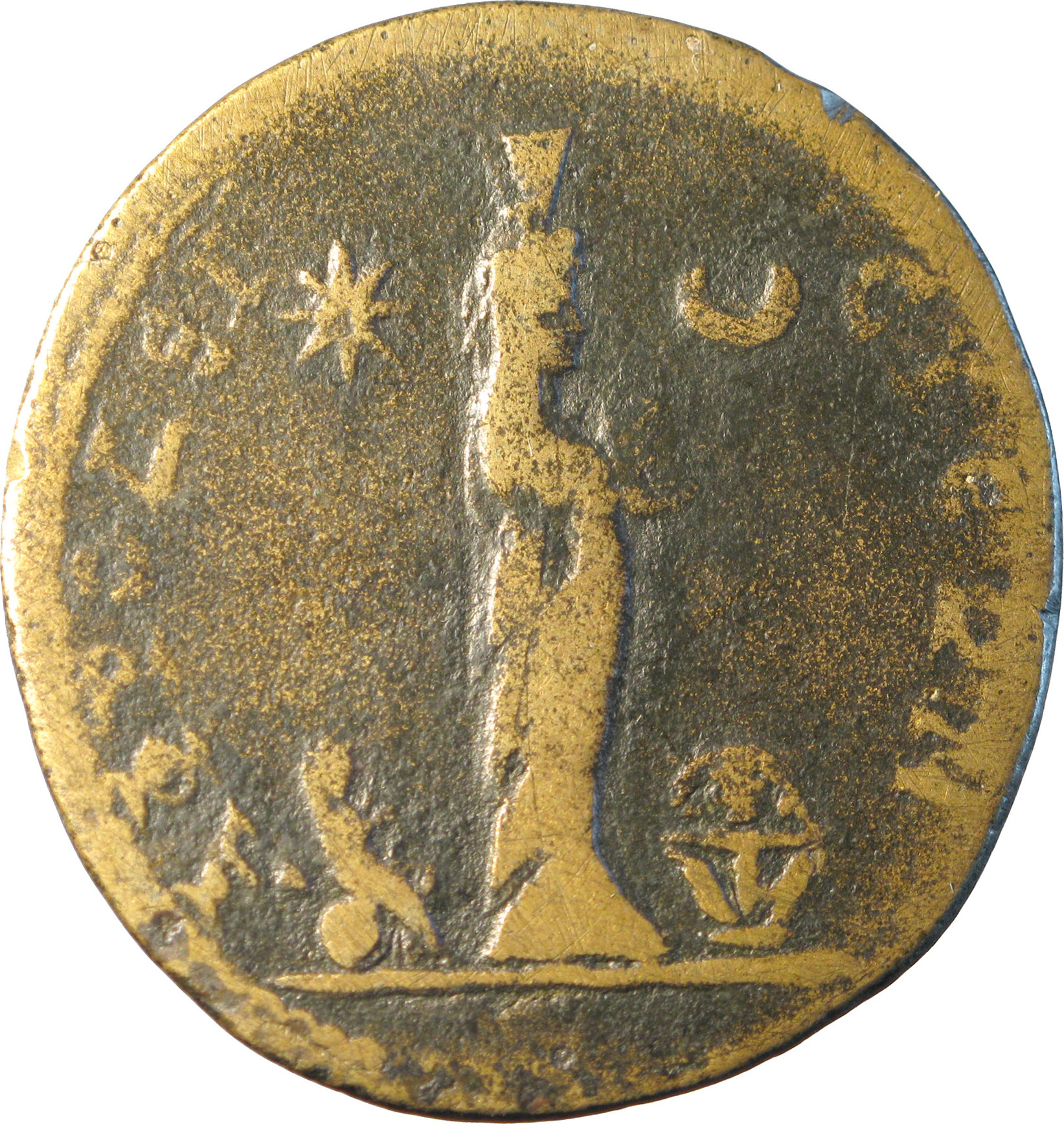 cult statue of Aphrodite of Aphrodisias right, at left priestess seated right and in upper field star, at right fountain (?) and in upper field crescent