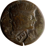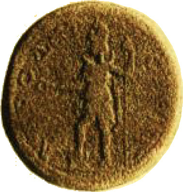 Mên standing with foot on bucranium, left, wearing Phrygian cap, holding patera and long sceptre; behind his shoulders, crescent