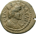 Apollo standing facing, head right, holding plectrum and lyre; at left, tripod entwined by serpent