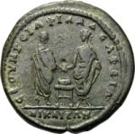 Caracalla and Geta in toga standing facing but looking at each other, shaking hands; between them, table, on which sits an agonistic crown