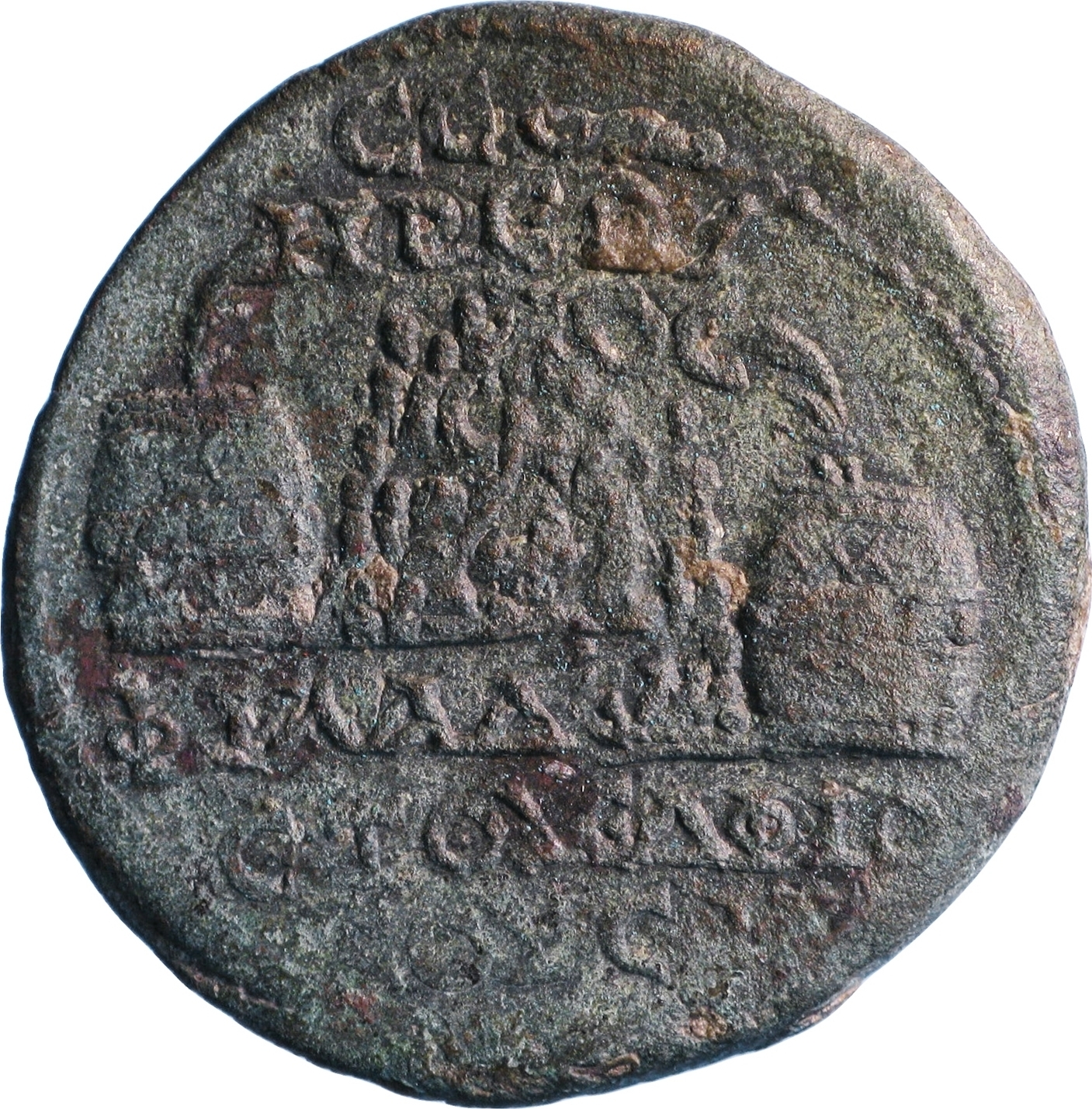 rev. doublestruck, so reading (especially date) not certain. All that is clear is ϹƐΟΥΡΙΟϹ ΦΙΛΑΔƐΛΦΙ [ ]ƐΤΟΥϹ [ ]. It seems that Sydenham read the doublestruck ƐΛ as ΙΔ.