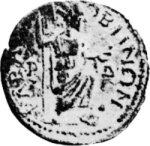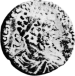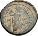 Tyche standing, right, her left foot on river god, right hand resting on sceptre, small bust on her extended left hand