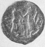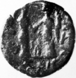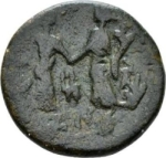 Io standing right facing Tyche standing left, clasping hands; Marnas symbol between them