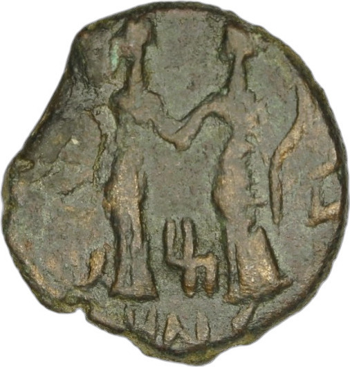 Io standing right facing Tyche standing left, clasping hands; Marnas symbol between them
