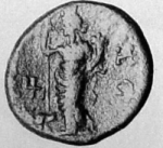 Tyche standing left, right hand resting on a long sceptre, holding a cornucopia in left hand; at feet to left, heifer standing left; Marnas symbol to left