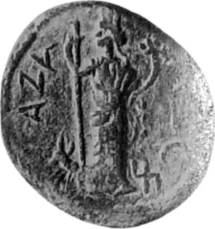 Tyche standing left, right hand resting on a long sceptre, holding a cornucopia in left hand; at feet to left, heifer standing left; Marnas symbol to right