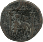 Artemis standing right, drawing arrow from quiver and holding bow, facing Marnas standing left, holding long sceptre; all within temple with two columns