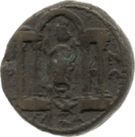 in a temple with four columns, Tyche standing left, right hand resting on a long sceptre, holding a cornucopia in left hand; at feet to left, heifer standing left; Marnas symbol to right c/m: star within rectangular incuse