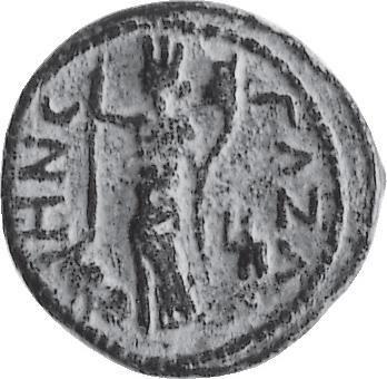 Tyche standing left, right hand resting on a long sceptre, holding a cornucopia in left hand; at feet to left, heifer standing left; Marnas symbol to right