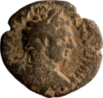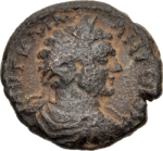 Tyche standing right, head left, holding cornucopia in left hand, small bust (or baetyl?) in right extended hand, left foot on prow(?); date in left field