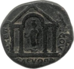 temple with four columns with central arch; within, Tyche facing, head left, holding cornucopia in left hand and small bust on extended right hand; at her feet, river god swiming, left