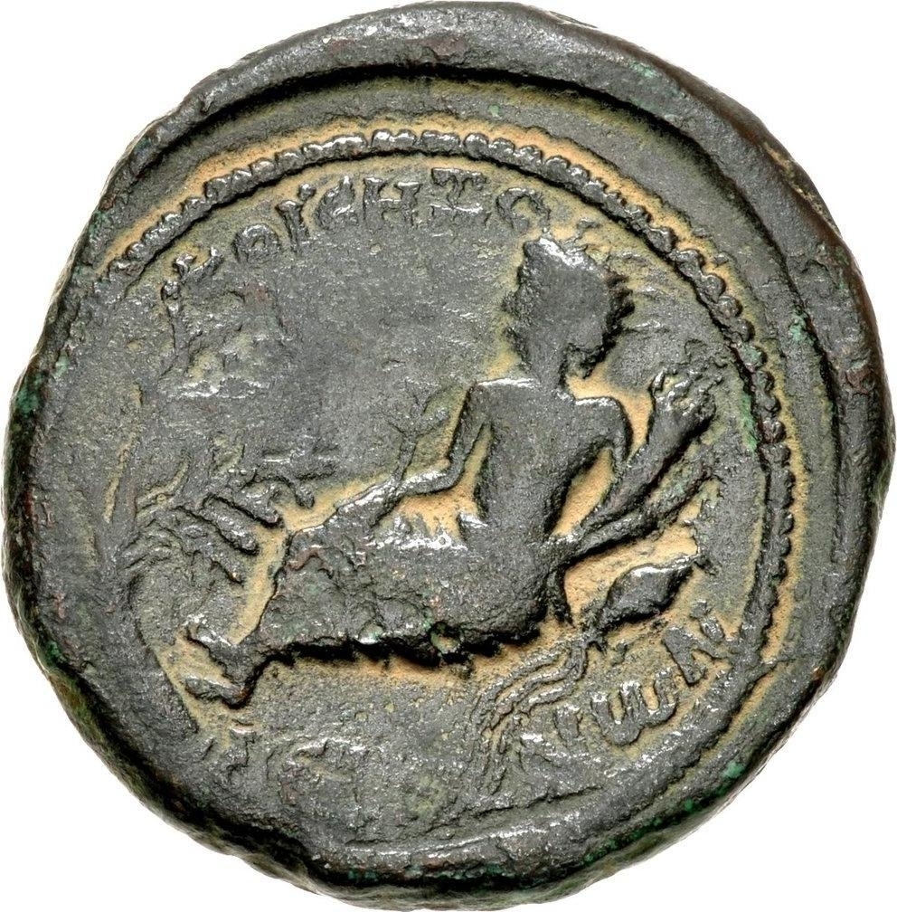 bearded river god reclining left on overturned amphora from which water flows, wearing reed crown, holding large reed in right hand, cornucopia in left; tree to the left