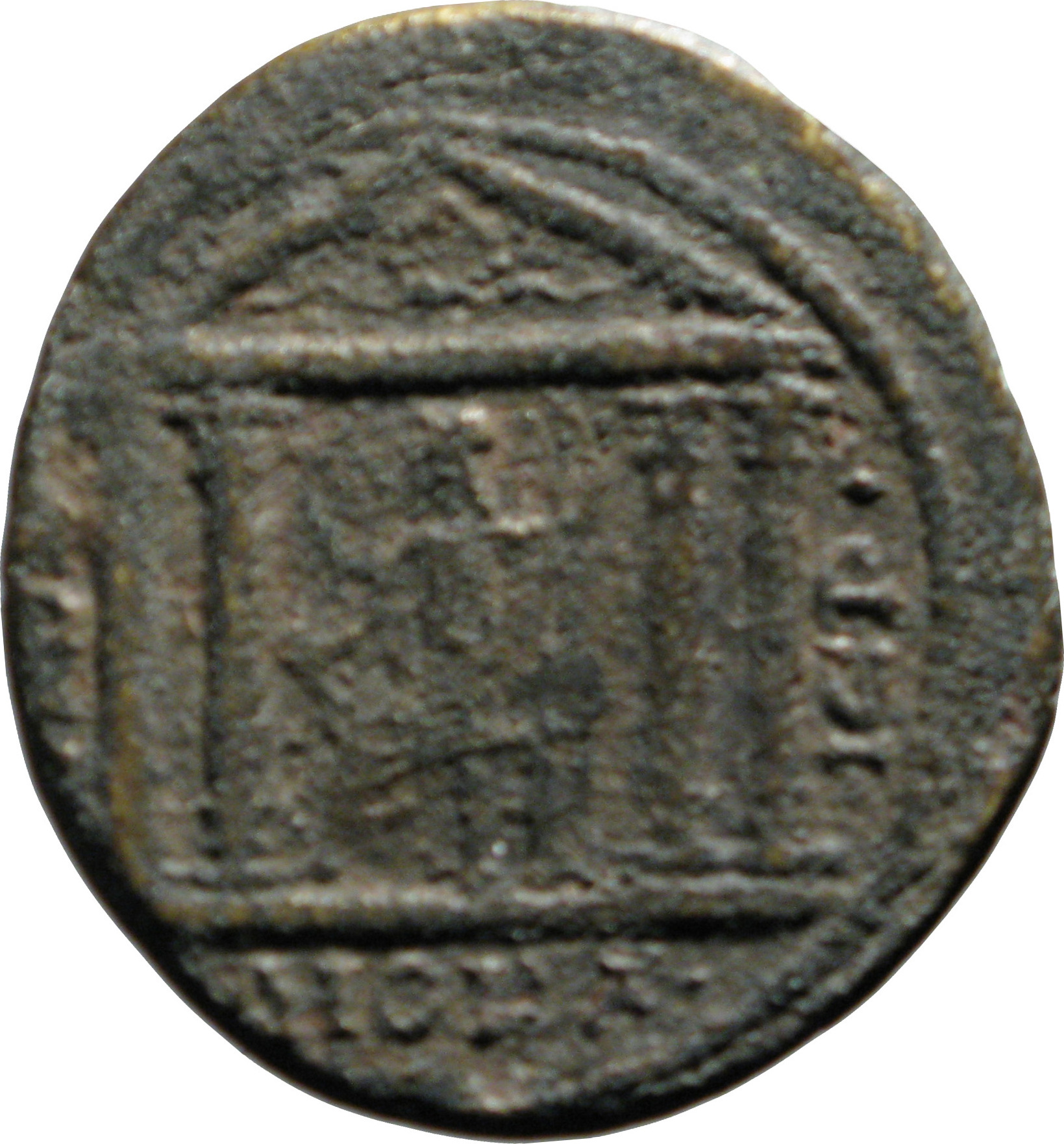 Zeus seated left, holding thunderbolt in right hand, left hand resting on sceptre, within temple with four columns with wreath in pediment