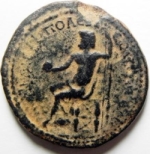 Zeus seated left on high-backed throne, feet on footstool, holding globe in right extended hand and left resting on sceptre |