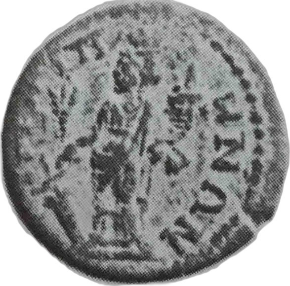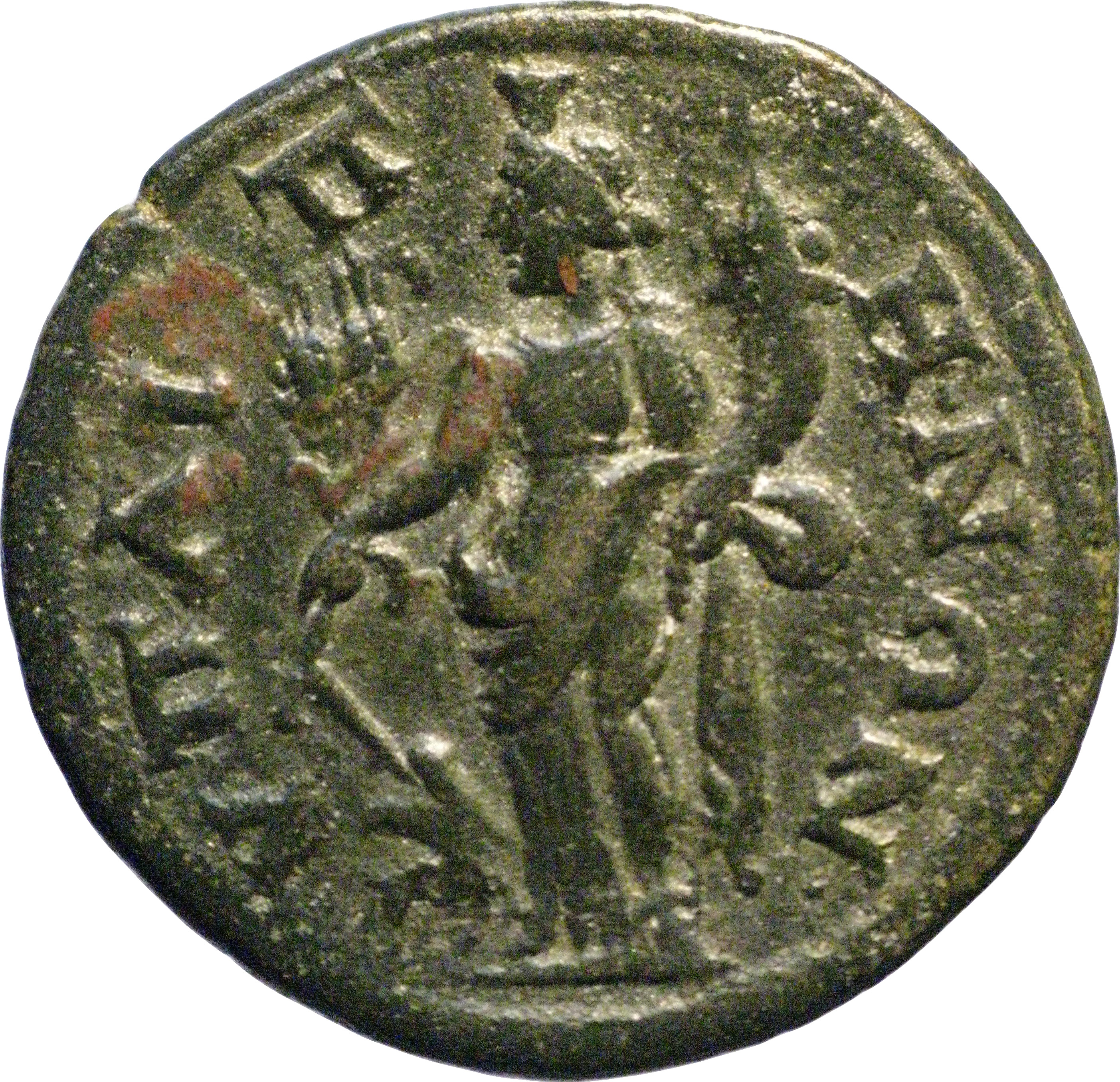 Tyche standing left, holding rudder with ears of corn and cornucopia