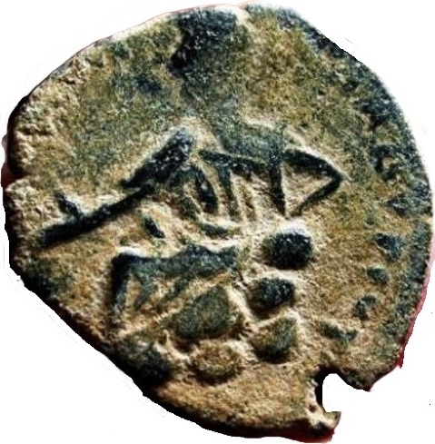 Tyche seated left on rocks, extending right hand and holding trophy in left