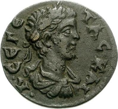 laureate, draped and cuirassed bust of Geta, right, seen from rear