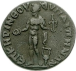 Apollo standing left, holding patera and statue of Artemis Anaïtis; at feet, lyre