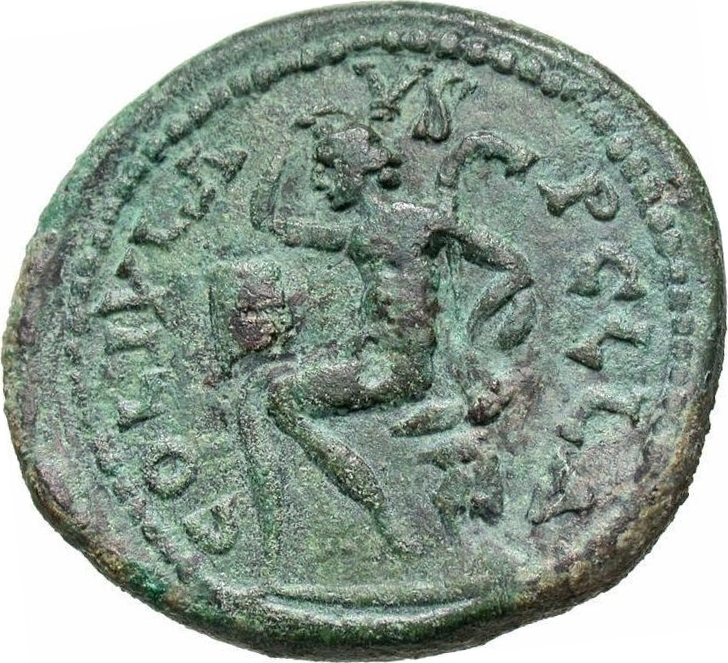 Pan seated left, on rock, raising his right hand to head, holding pedum in his left; in field, left, syrinx