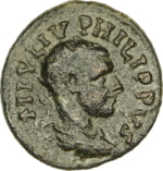 radiate, draped and cuirassed bust of Philip II, right, seen from rear