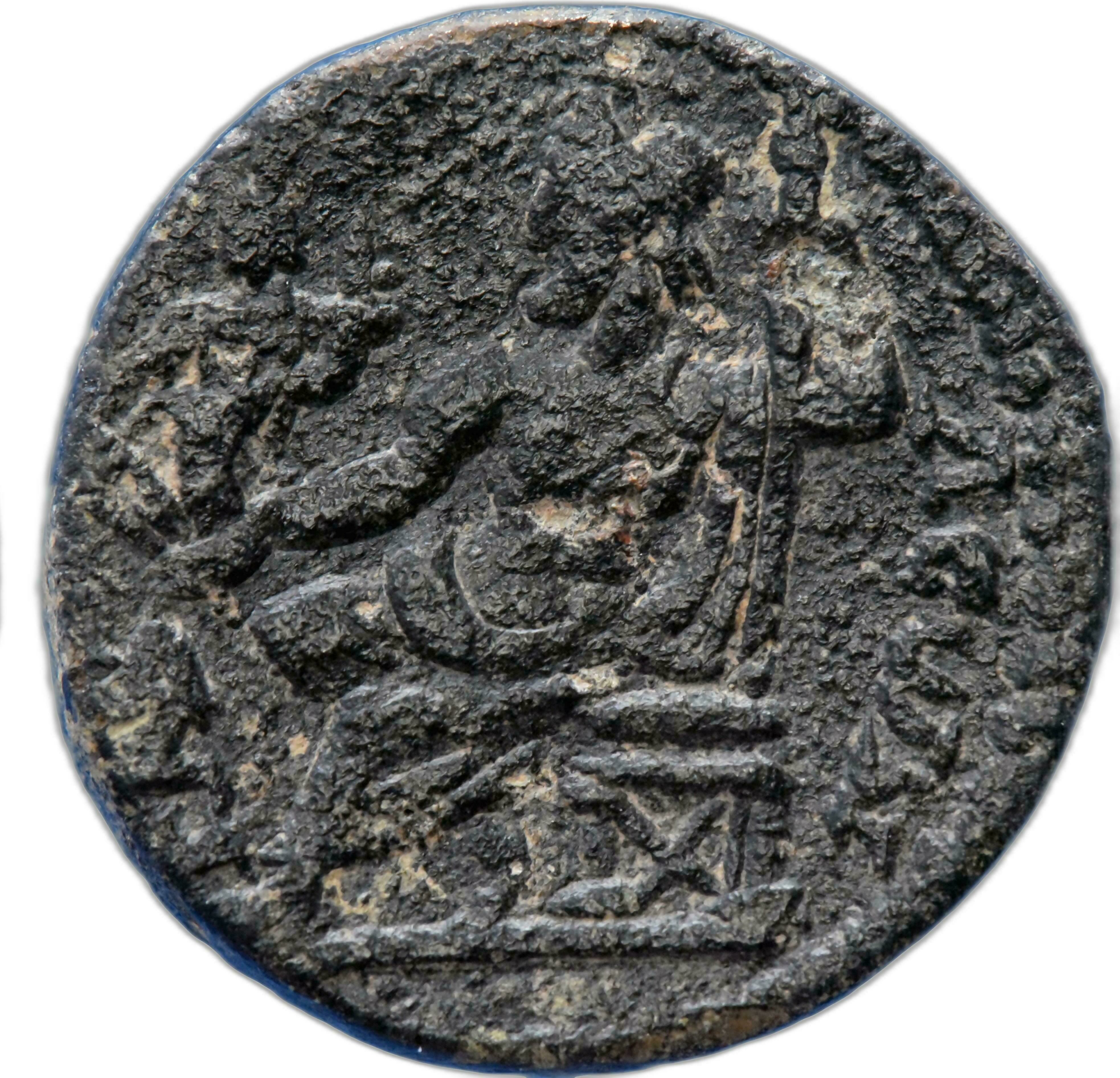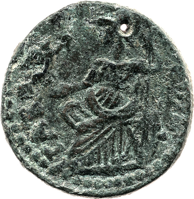 Athena seated left, wearing helmet, holding Nike in extended right hand, left resting on spear; to right, shield