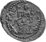 Tyche seated left, holding rudder in right hand and cornucopia in left