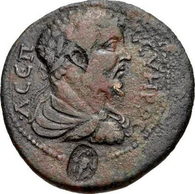 Tyche standing right, holding sceptre and wreath, facing Septimius Severus standing left, holding statue of Artemis Anaïtis and sceptre |