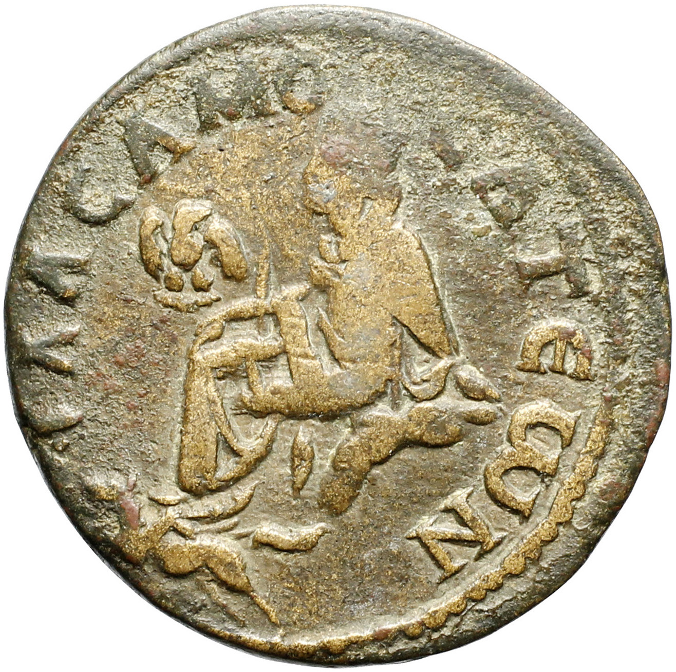 Tyche seated left, on rock, veiled and turreted, holding corn ears, eagle on wrist; before, Pegasus leaping left