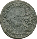 Cybele seated in biga of lions, left, holding patera and resting arm on tympanum |