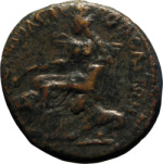 Dea Syria seated left, holding corn ear in her right hand and leaning left elbow on throne on each side of which, lion left