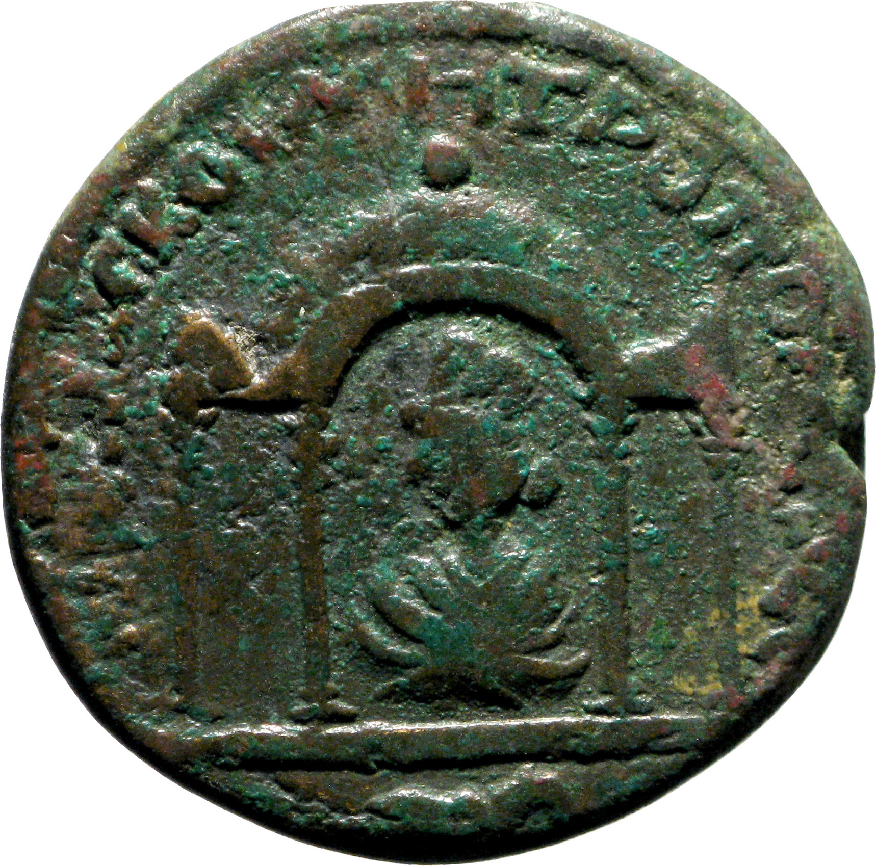arcuated shrine with four columns, within draped and turreted bust of Tyche left; below, animal leaping left