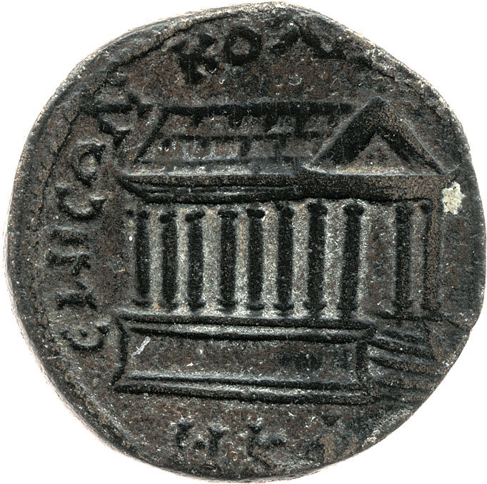 three-quarter right view of temple on high podium with twelve columns represented; crescent(?) in pediment; date in exergue