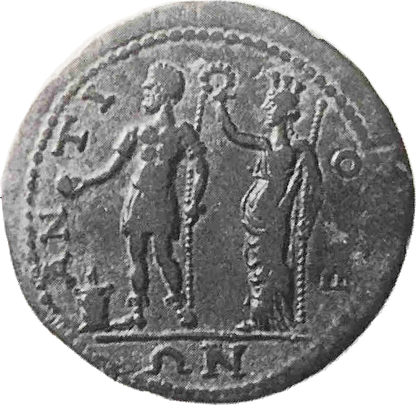 Septimius Severus, in military dress, standing left, holding sceptre and patera over lighted altar, crownded by Tyche of Antioch turreted, standing left, holding crown and sceptre