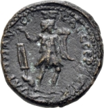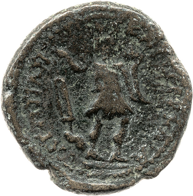 Tyche standing facing, head right, holding rudder in right hand and cornucopia in left |